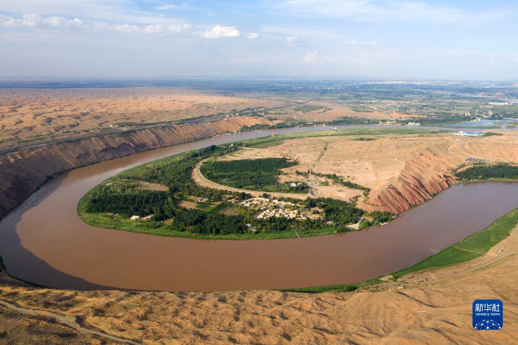 7月19日拍攝的植被覆蓋的中衛市黃河沿岸(無人機照片)。