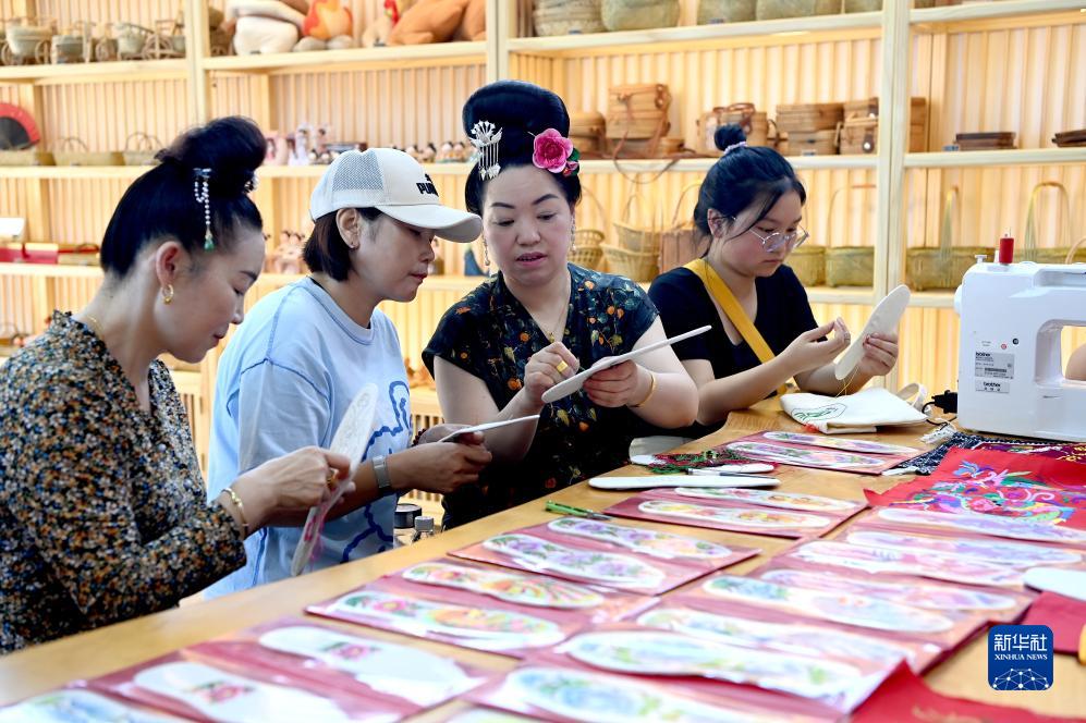 在陜西省漢中市留壩縣老街內的一家手工店舖裏,當地婦聯邀請來自鎮巴縣的苗繡老師(右二)為當地婦女及游客教授苗繡(7月25日攝)。