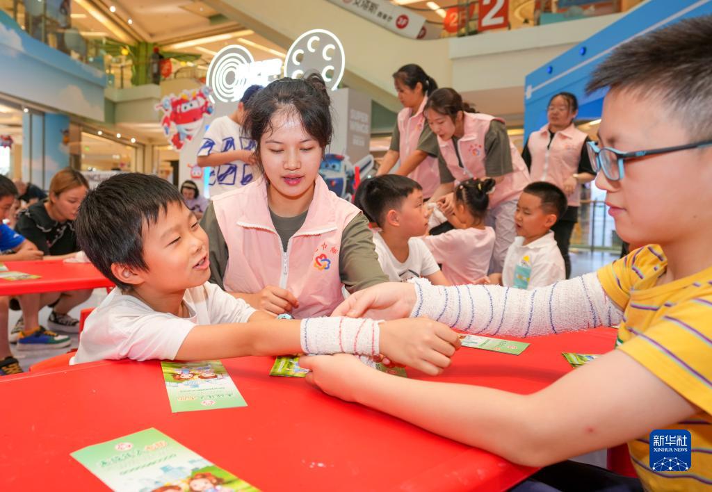 7月25日,在重慶市九龍坡區楊家坪街道一商場的預防溺水安全教育社區服務點,青少年在巾幗志願者的指導下體驗簡易包紮技能。