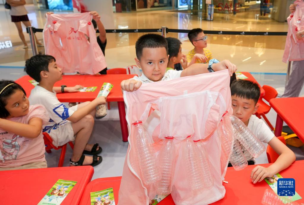 7月25日,在重慶市九龍坡區楊家坪街道一商場的預防溺水安全教育社區服務點,一名小男孩展示利用學習到的預防溺水知識製作的簡易救生衣。