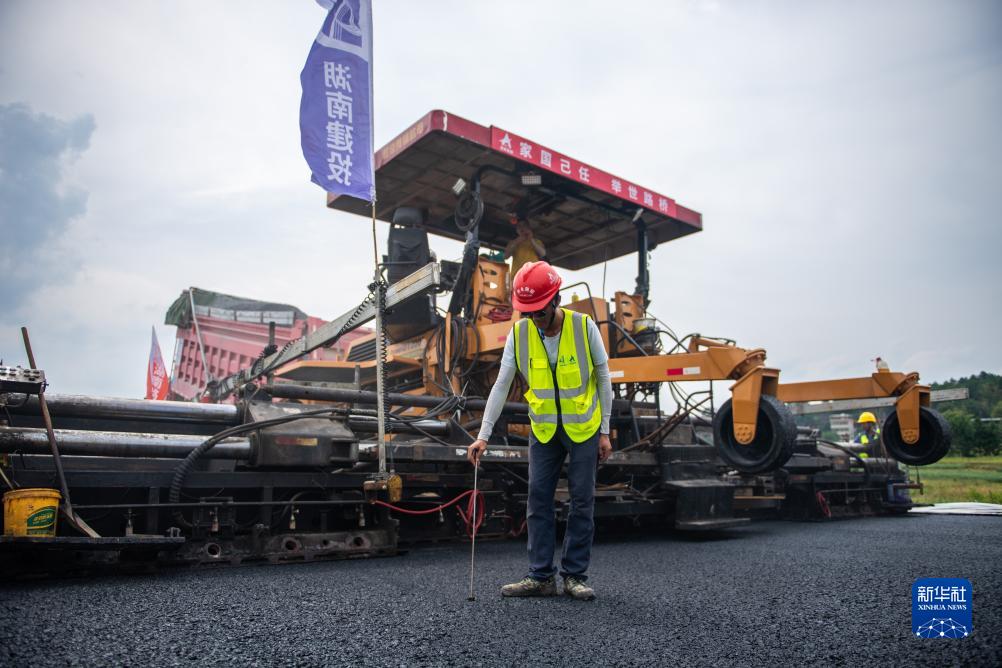 7月25日,在衡永高速路面工程施工現場,工人在測量瀝青攤鋪厚度。
