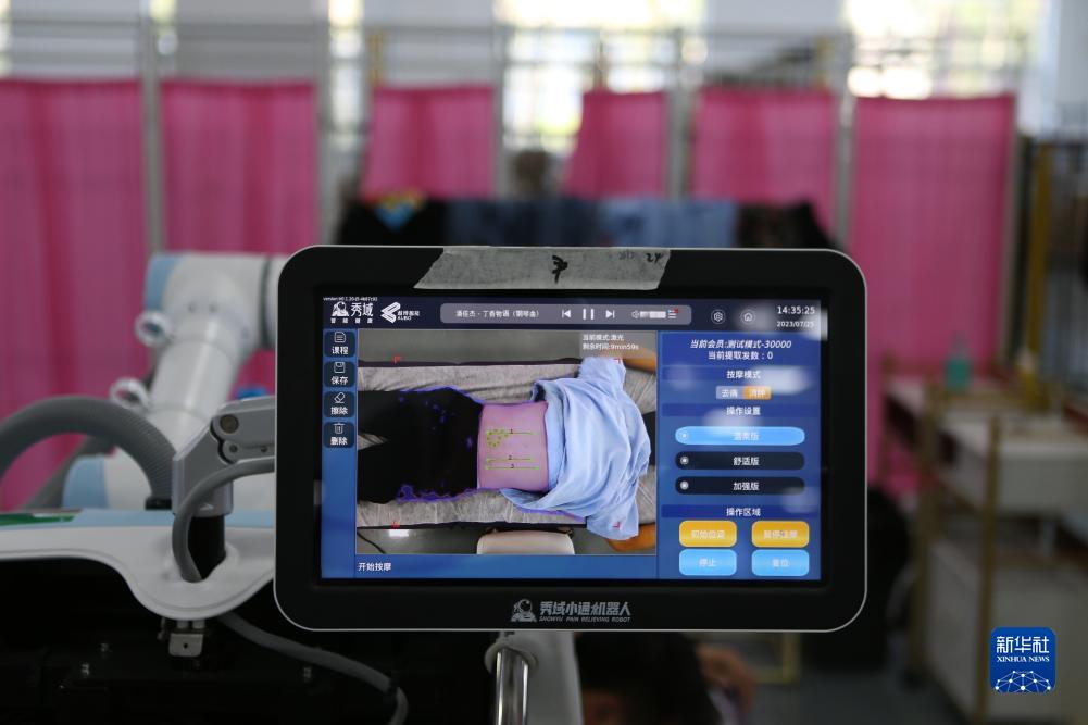 7月25日,在位於淄博市臨淄區的遨博(山東)智能機器人有限公司,一名男士在體驗該公司開發的康復理療機器人。