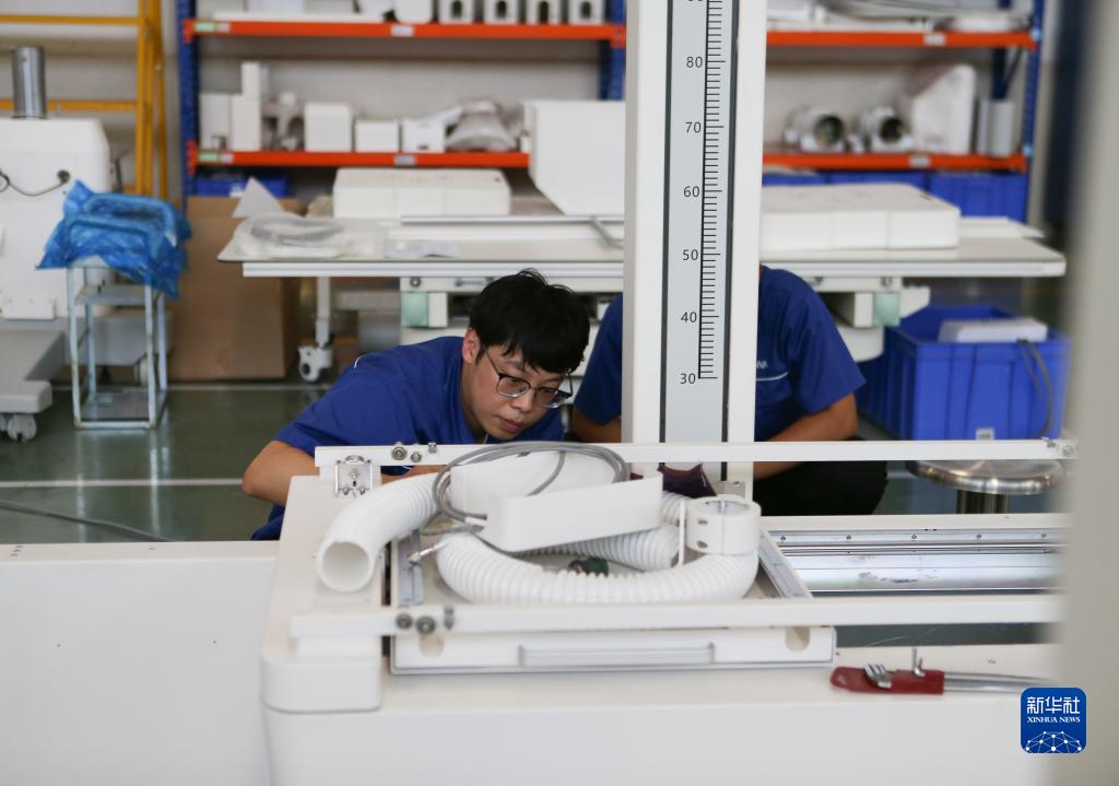 7月25日,在位於淄博市高新區的山東新華醫療器械股份有限公司,工作人員在車間組裝醫療設備。