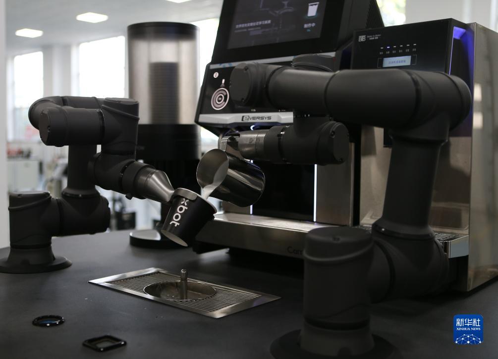 7月25日,在位於淄博市臨淄區的遨博(山東)智能機器人有限公司,機器人在製作咖啡。