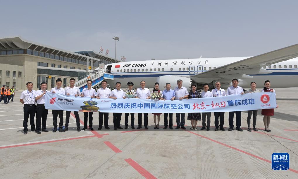 7月25日,參加北京至和田首航的國航工作人員在和田昆岡機場合影。新華社記者 李賀 攝