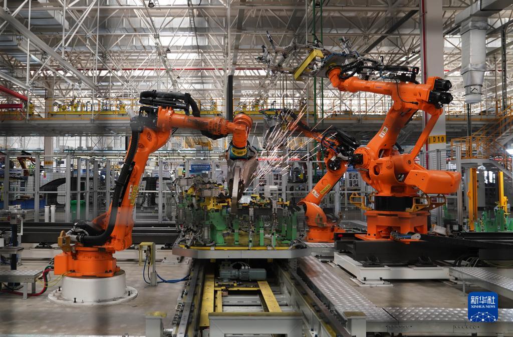在位於江西省南昌市經開區的江鈴集團新能源汽車有限公司生産基地車間內,機器人在生産線上作業(7月18日攝)。新華社記者 周密 攝