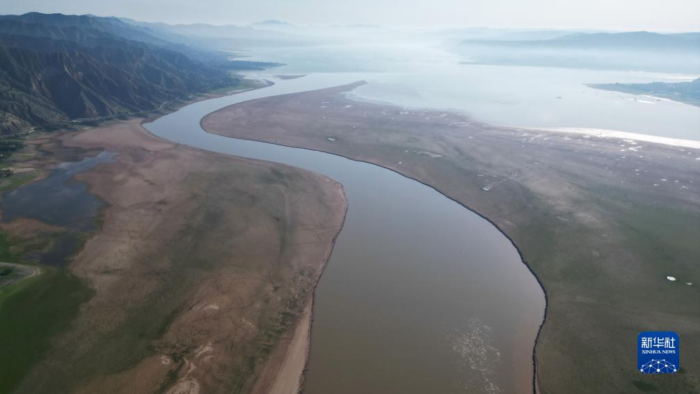 劉家峽水庫水位下降,大片河灘裸露(7月24日攝,無人機照片)。