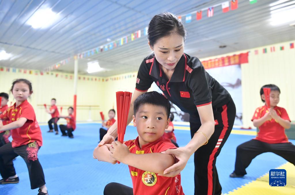 7月25日,在河南省夏邑縣靜武堂,學生在老師的指導下練習武術。新華社發(苗育才 攝)