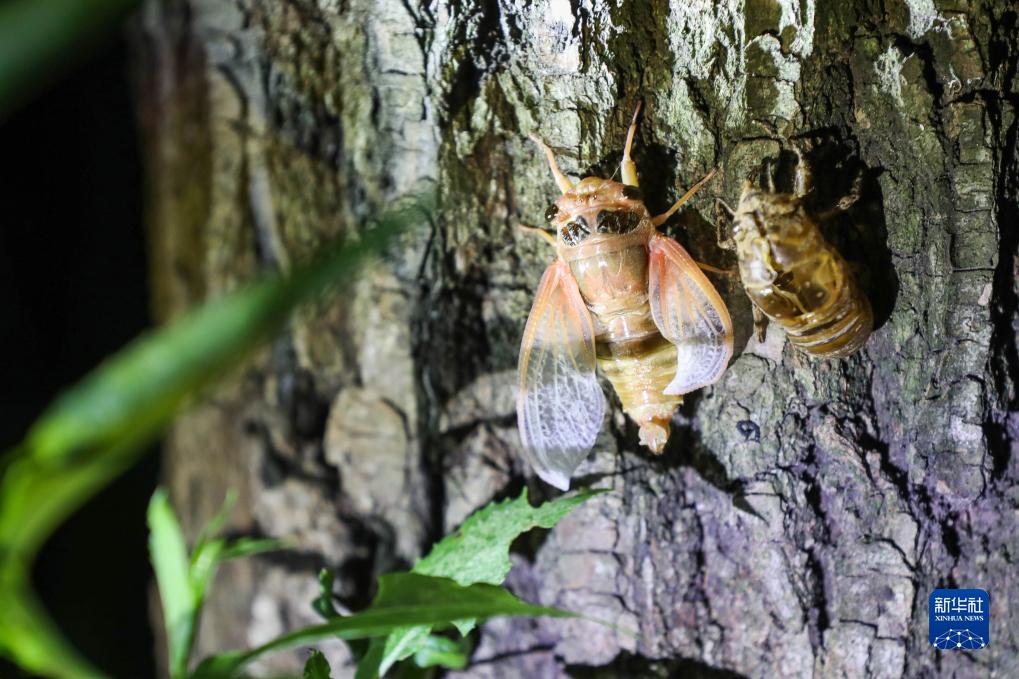 7月24日晚在寶豐縣鬧店鎮連店村一處林下金蟬養殖基地拍攝的金蟬。新華社發(何五昌攝)