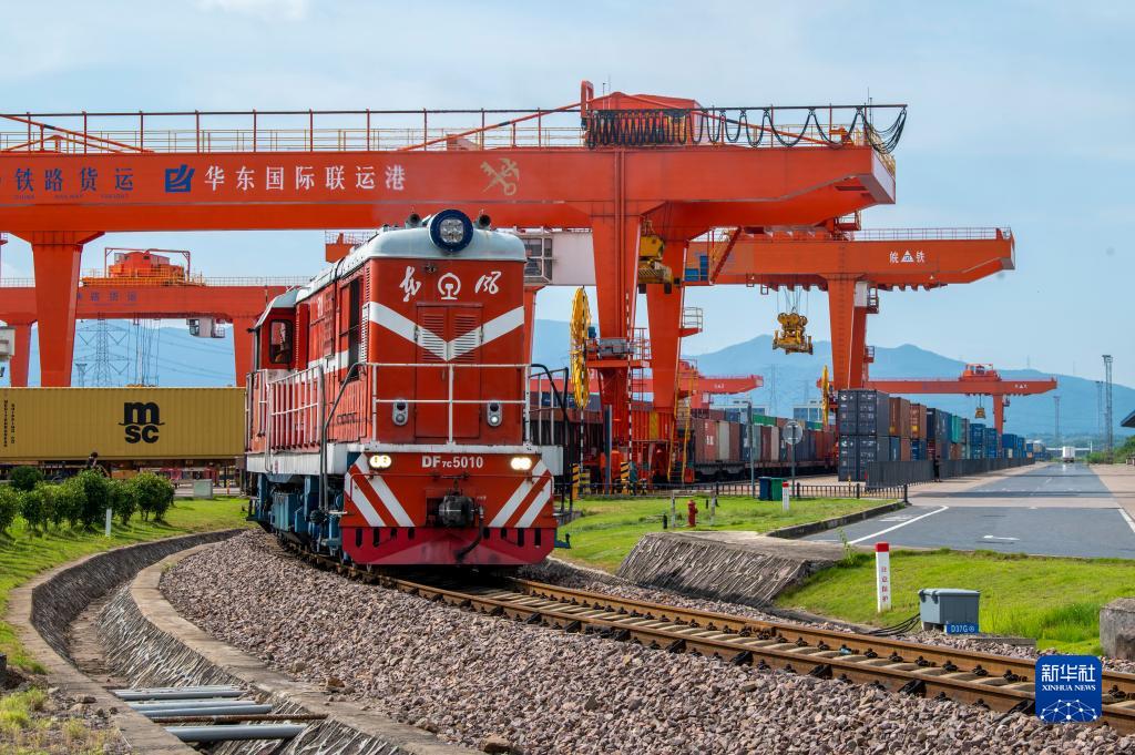 7月25日,在浙江省金華市華東國際聯運港,一輛“義新歐”中歐班列在海關監管下,裝載着110個標箱日用百貨、家用電器、家裝材料等貨物,啟程駛向哈薩克斯坦。