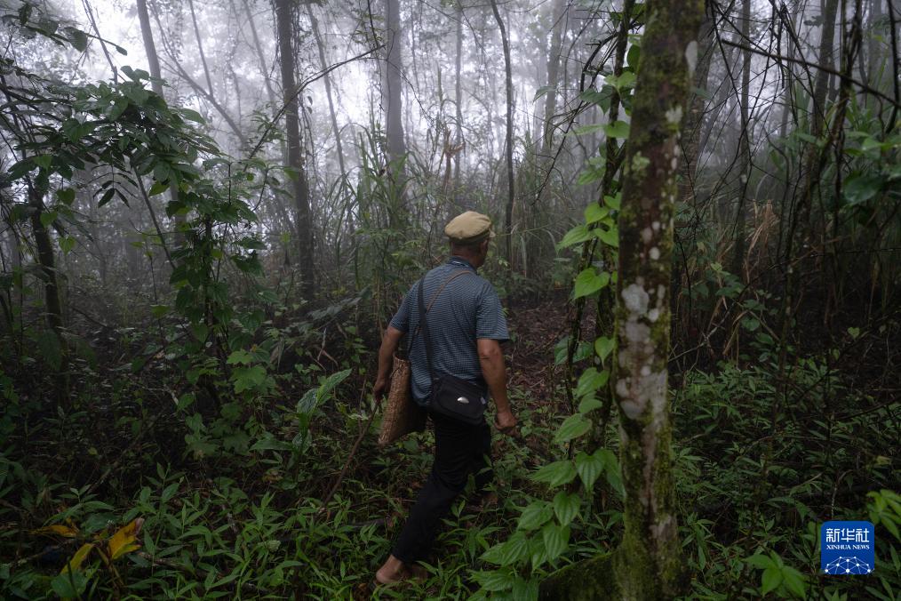 7月23日,張普忠在樹林中行走,準備前往自己曾經住過的新民寨。新華社記者 費茂華 攝