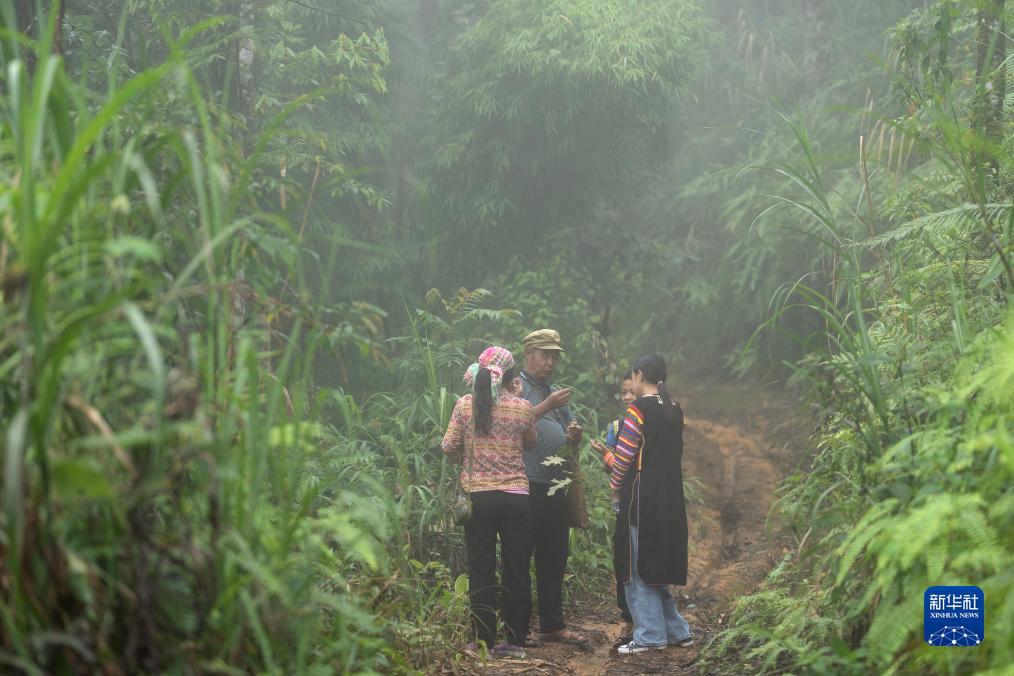 7月23日,張普忠(左二)在樹林中邊走邊説,向孩子們介紹野果、草藥等知識。新華社記者 費茂華 攝