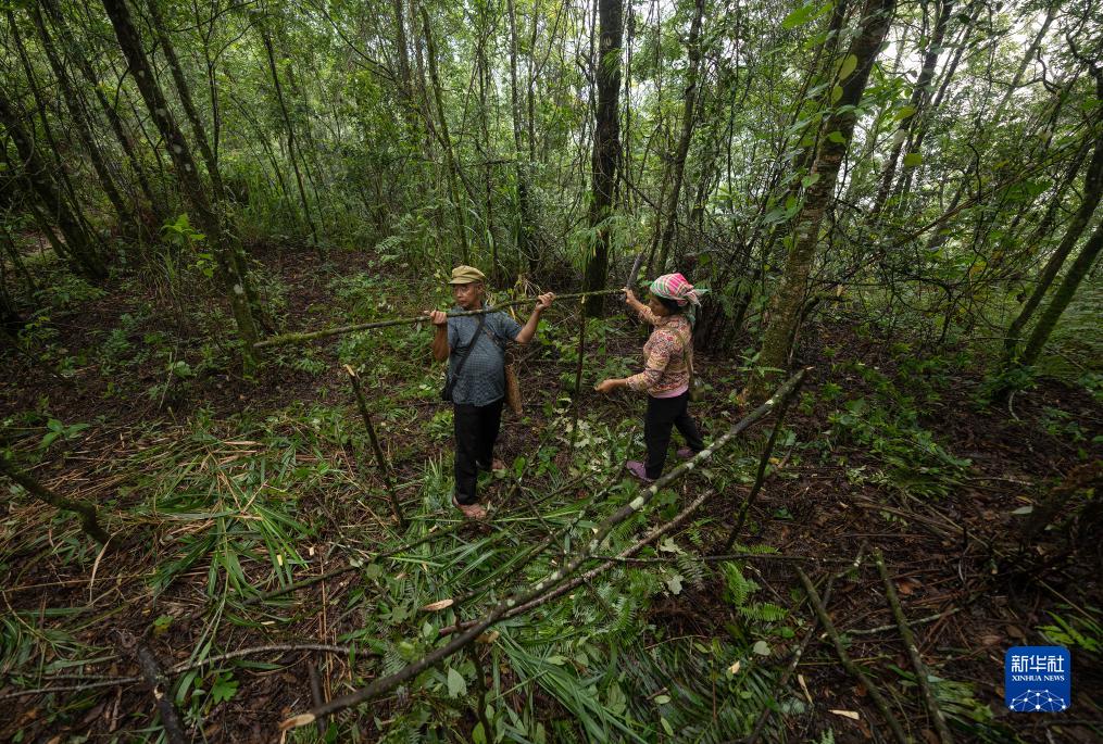 7月23日,張普忠(左)和老伴王素英在搭建芭蕉葉棚子。新華社記者 費茂華 攝