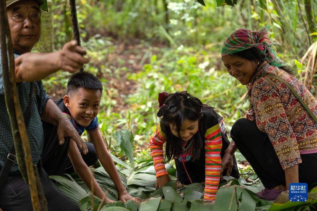 7月23日,張普忠(左一)和老伴王素英(右一)、孫子張偉軍(左二)、小孫女張麗紅一起鑽進芭蕉葉棚子。新華社記者 費茂華 攝