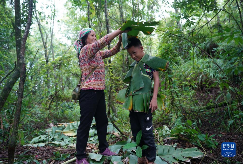 7月23日,張普忠的老伴王素英(左)用芭蕉葉給孫子製作“衣服”。新華社記者 陳欣波 攝