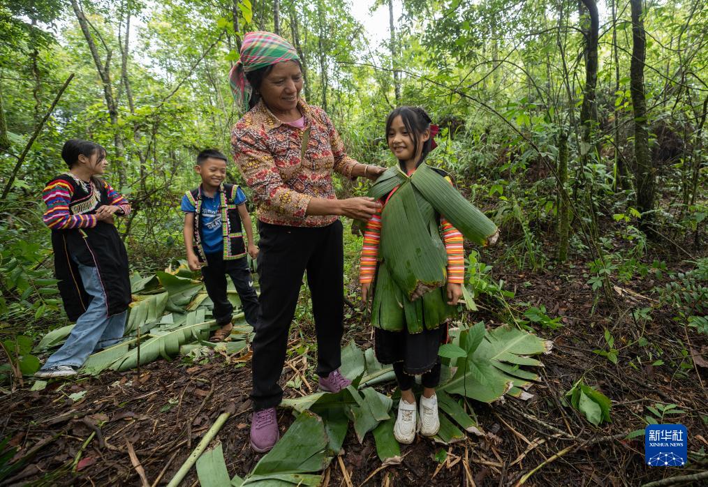 7月23日,張普忠的老伴王素英(右二)用芭蕉葉為小孫女張麗紅製作“衣服”。新華社記者 費茂華 攝