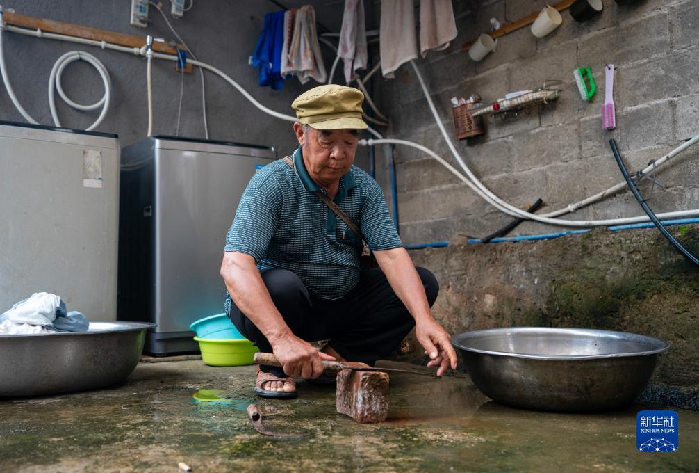 張普忠在家中院子裏磨刀為上山做準備(7月23日攝)。新華社記者 陳欣波 攝