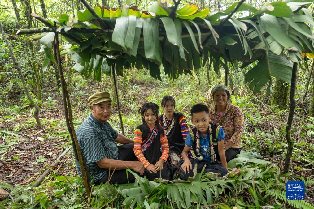 7月23日,張普忠和家人在芭蕉葉棚子裏合影,從左至右為張普忠、小孫女張麗紅、大孫女張英、孫子張偉軍和老伴王素英。新華社記者 費茂華 攝