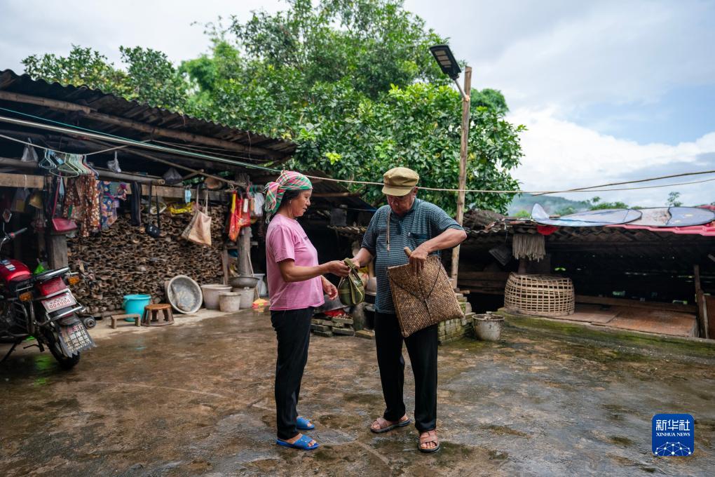 7月23日,上山前,張普忠的妻子(左)把準備的水和乾糧交給張普忠。新華社記者 陳欣波 攝