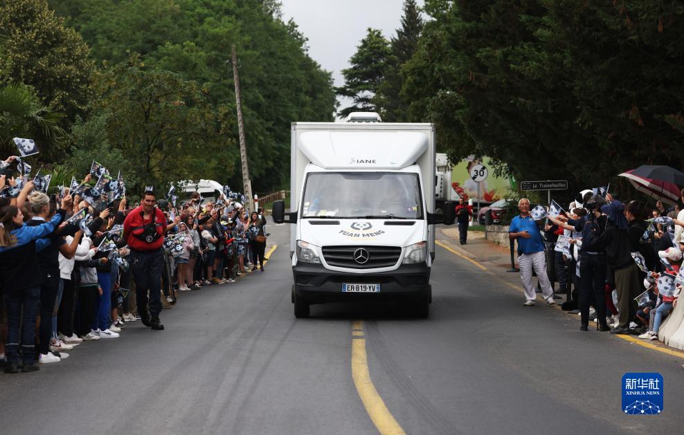 7月25日,在法國聖艾尼昂市博瓦勒野生動物園外,人們送別搭載熊貓“圓夢”的車離開。