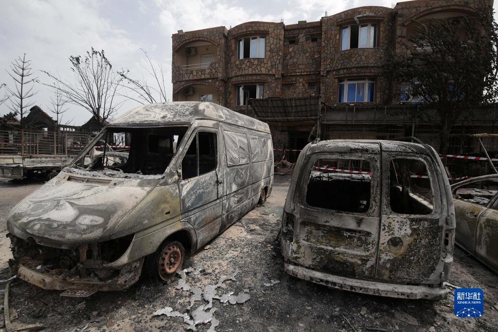 這是7月25日在阿爾及利亞貝賈亞省拍攝的被野火燒燬的房屋和車輛。