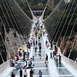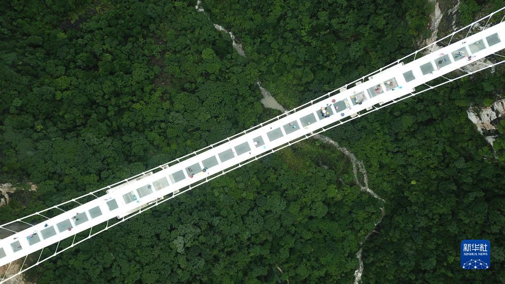 7月25日,游客在張家界大峽谷景區玻璃橋游覽(無人機照片)。