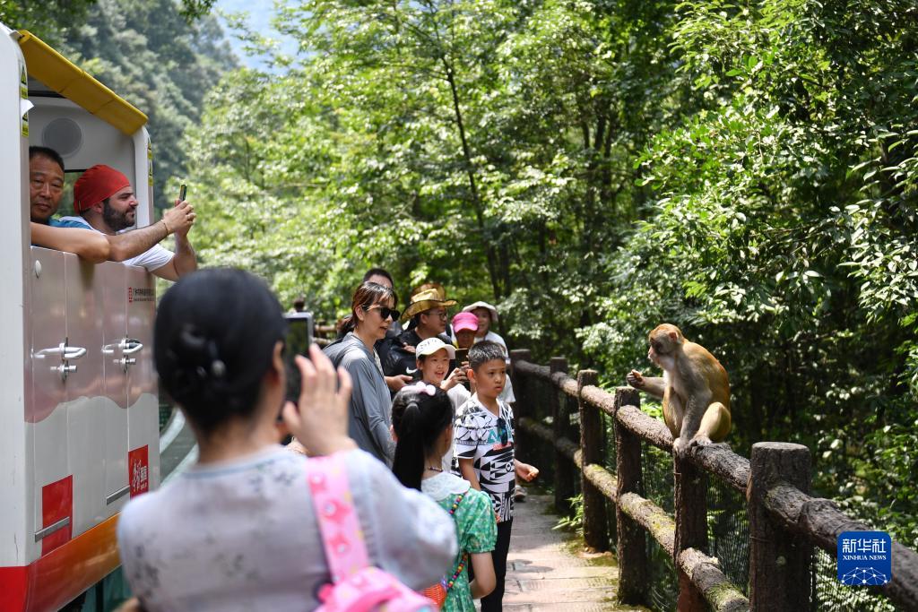 7月24日,在張家界國家森林公園十里畫廊景區,游客和獼猴互動。