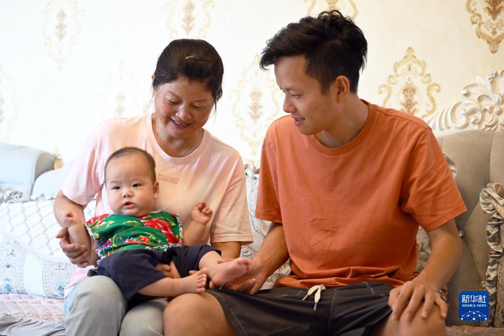 7月24日,陳蘭香和兒子張成偉、孫子張錦亦在上岸後的新家裏。新華社記者 周牧 攝