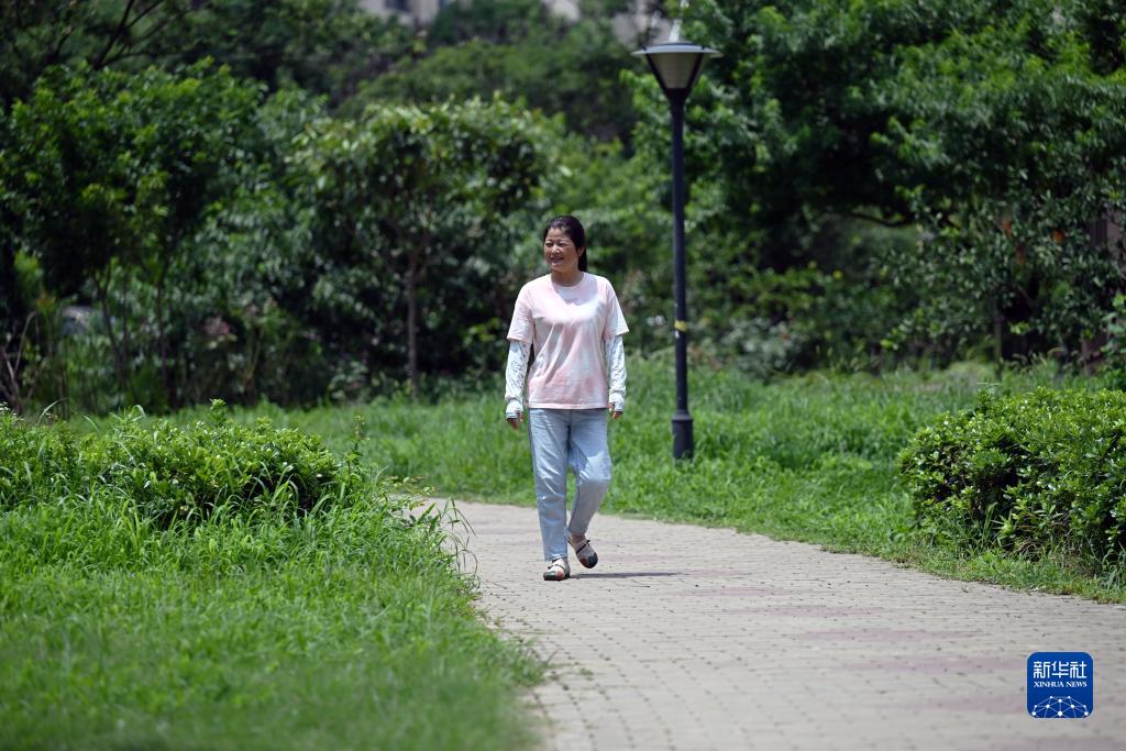 7月24日,陳蘭香在上岸後新家所在的小區裏散步。新華社記者 周牧 攝