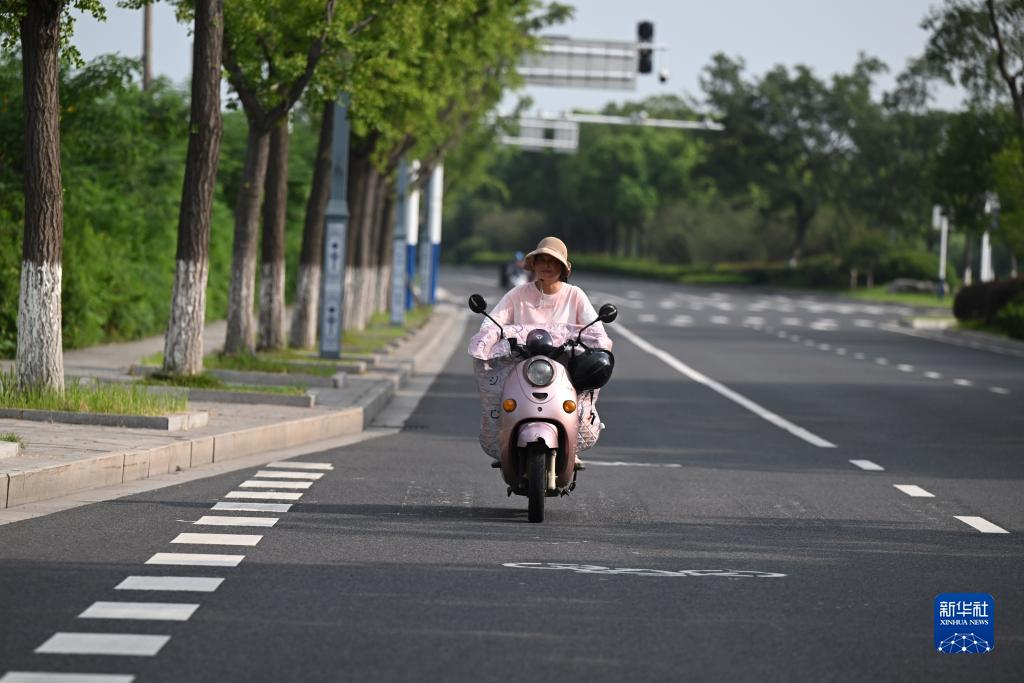 7月24日,陳蘭香騎車前往三姑娘勞務服務有限公司一處勞務項目地點。新華社記者 周牧 攝