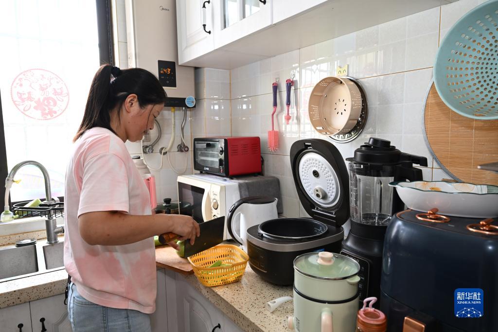 7月24日,陳蘭香在上岸後的新家裏做飯。新華社記者 周牧 攝