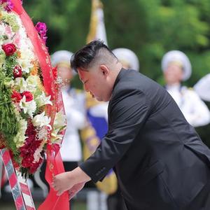 這張朝中社7月26日提供的照片顯示,朝鮮勞動黨總書記、國務委員長金正恩在朝鮮祖國解放戰爭勝利70周年之際,參謁位於平安南道檜倉郡的中國人民志願軍烈士陵園。