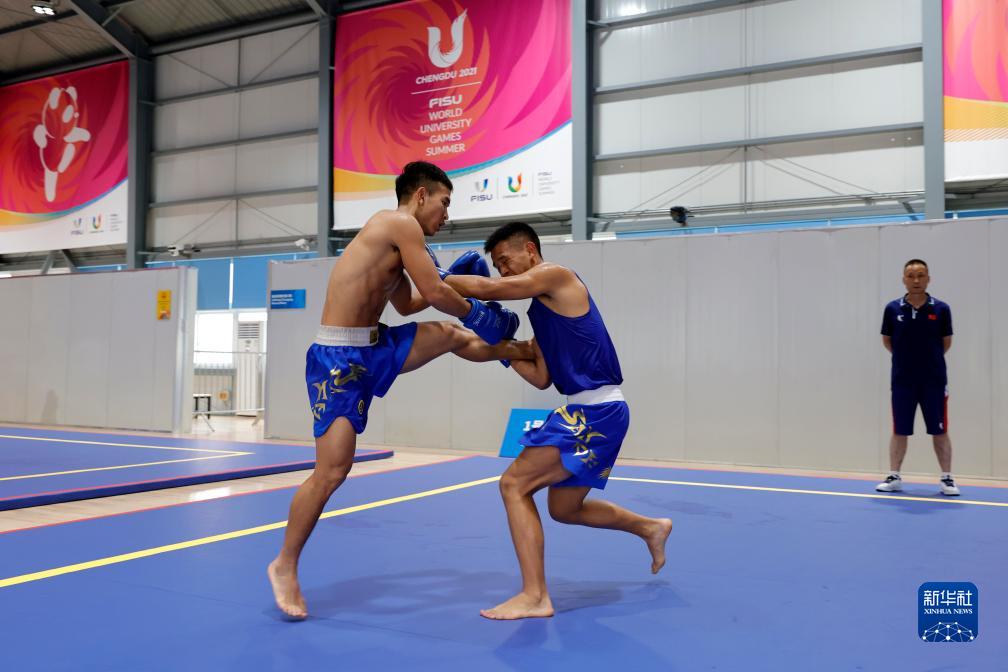 7月25日,參加第31屆世界大學生夏季運動會武術散打比賽的中國選手在成都城北體育館訓練。