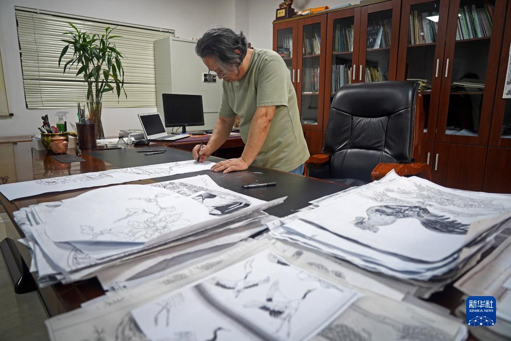 黃俊軍在工作室裏繪製銅雕草圖(7月13日攝)。