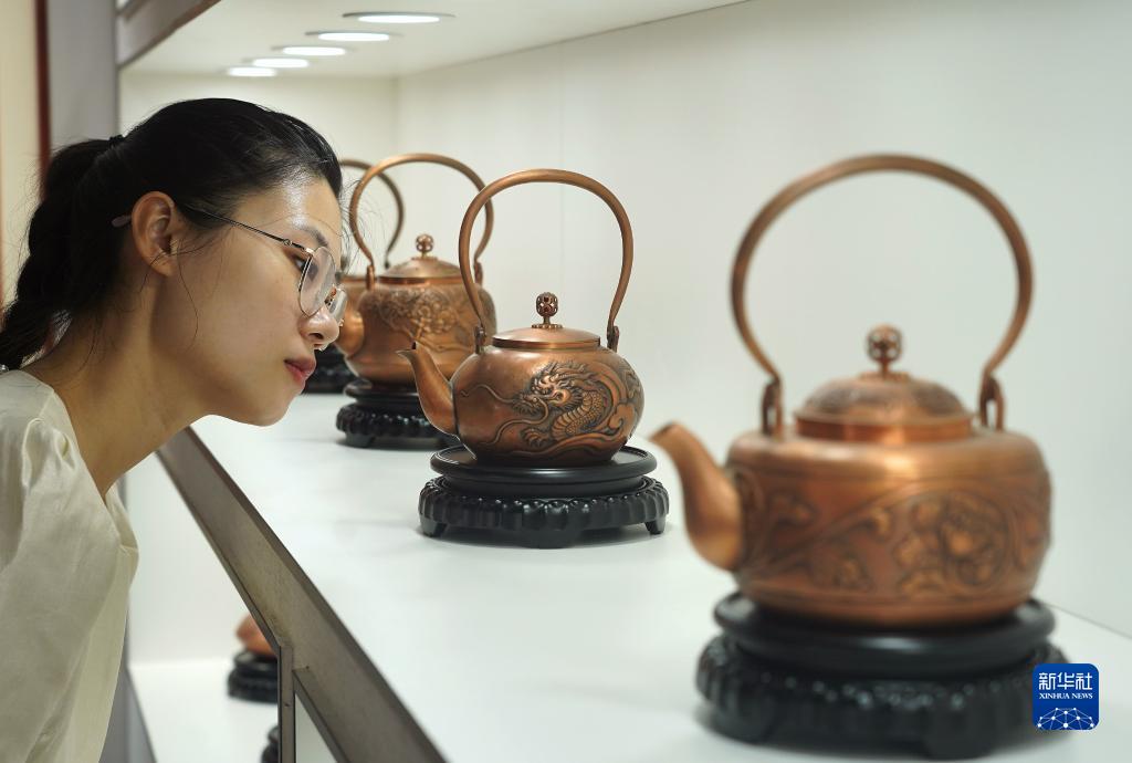 參觀者在江西中鼎金屬工藝有限公司的展廳裏觀賞銅壺工藝品(7月13日攝)。