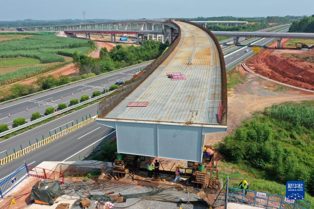 7月26日,在廣西賓陽縣境內,中鐵上海工程局工人在上橫高速公路施工現場作業(無人機照片)。
