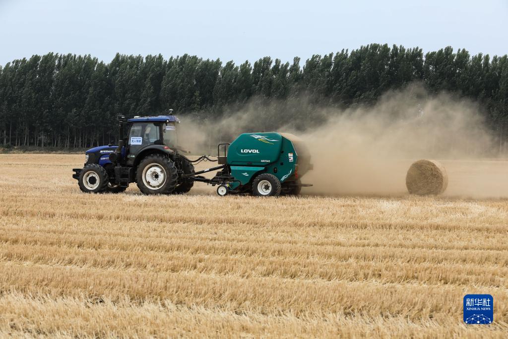 在濰坊市坊子區濰柴雷沃智慧農業示範基地,一輛無人駕駛農機進行打捆作業(6月17日攝)。