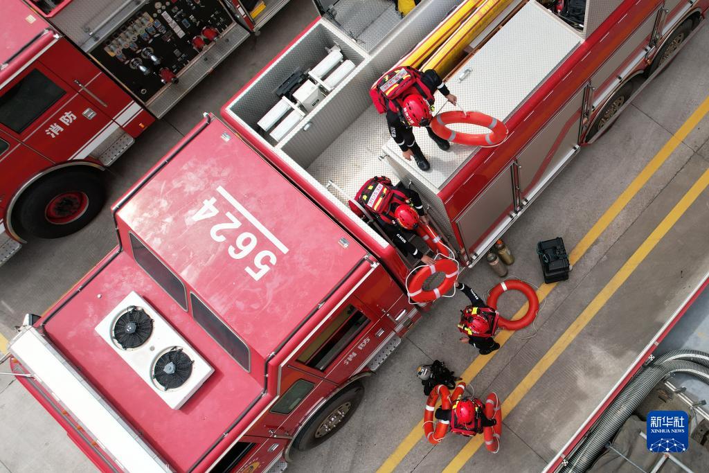 7月26日,在福建省廈門市海滄區港區消防救援站,消防員將水上救生設備裝上消防車(無人機照片)。