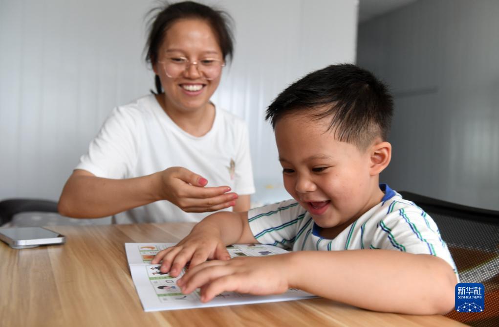7月26日,在廣西上橫高速公路建設工地職工宿舍活動板房裏,來自廣西來賓市的韋靖楷在媽媽的指導下看圖識字。