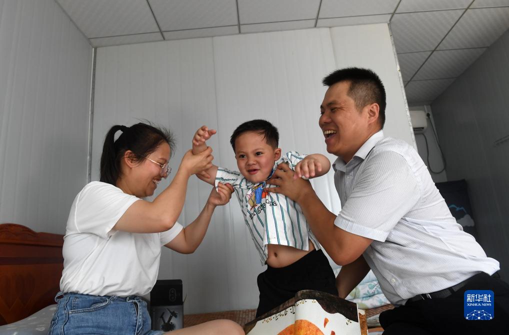 7月26日,在廣西上橫高速公路建設工地職工宿舍活動板房裏,來自廣西來賓市的韋靖楷和爸爸媽媽一起玩耍。