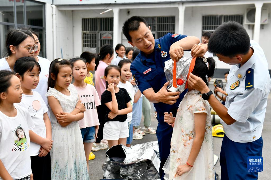 7月26日,在莒縣龍山鎮東樓村“小草學堂”,莒縣消防救援大隊的指戰員為孩子試戴防毒面罩並講授消防安全知識。