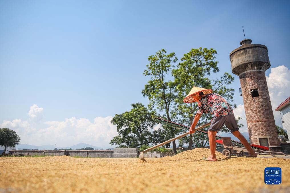 夏收時節,湖南省永州市藍山縣早稻喜獲豐收,農民趁着晴好天氣忙着收割、晾曬,一派豐收景象。