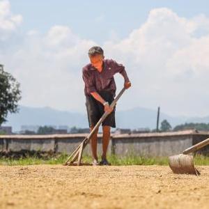7月26日,湖南省永州市藍山縣塔峰鎮成家村村民在晾曬稻穀。