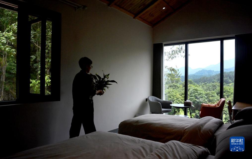 7月24日,陜西省漢中市留壩縣火燒店鎮望星&村松間民宿內,工作人員在整理房間。