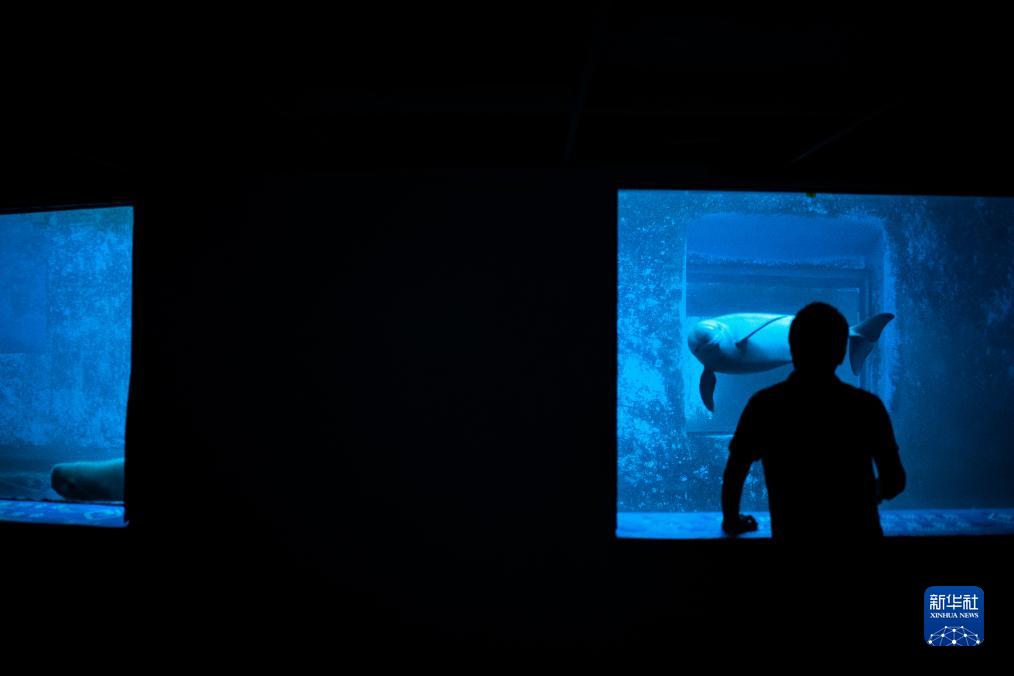 7月12日,中國科學院水生生物研究所研究人員觀察館內的長江江豚。
