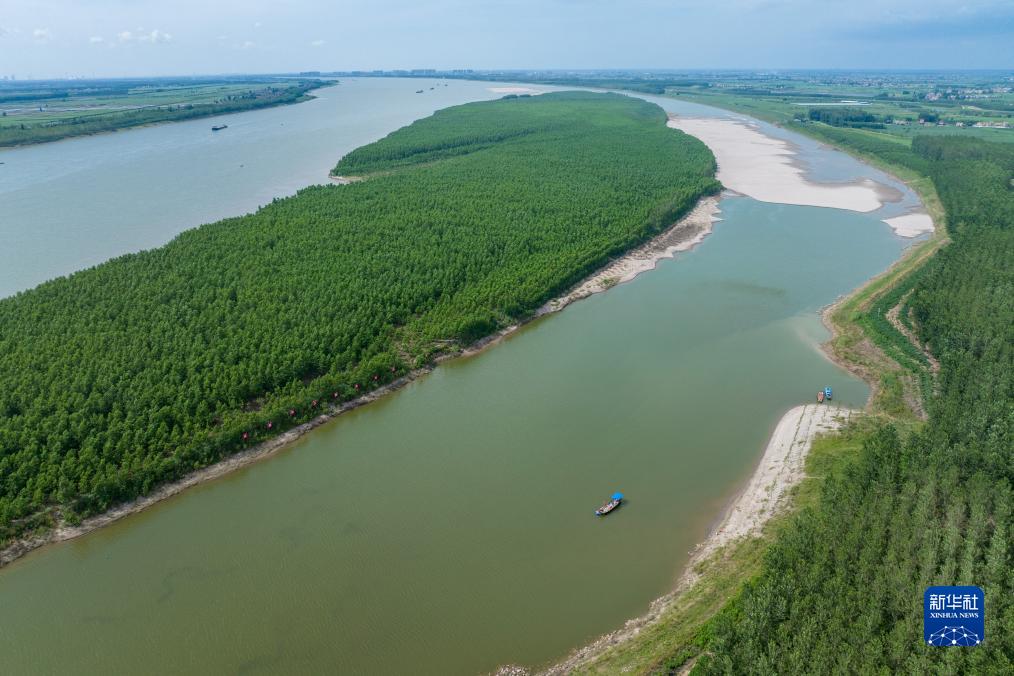 6月27日,中國科學院水生生物研究所鯨類保護生物學學科組工作人員在天鵝洲江豚放歸適應區水域回收聲學檢測設備(無人機照片)。
