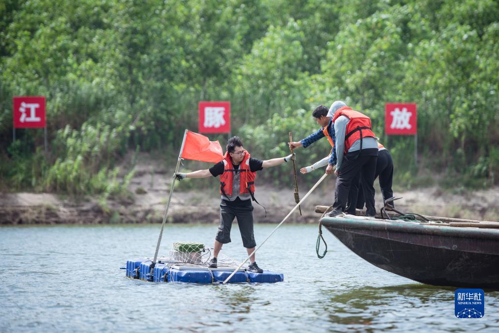6月27日,中國科學院水生生物研究所鯨類保護生物學學科組工作人員在天鵝洲江豚放歸適應區水域回收聲學檢測設備。