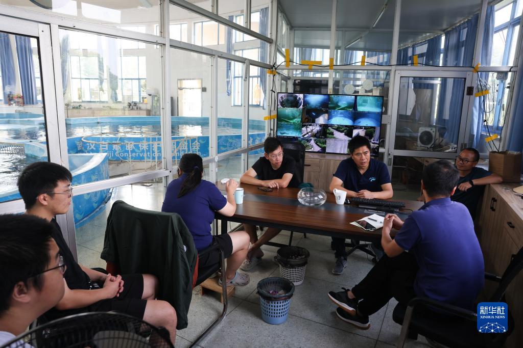 7月12日,中國科學院水生生物研究所白鱀豚館訓練員在討論長江江豚喂養方案。