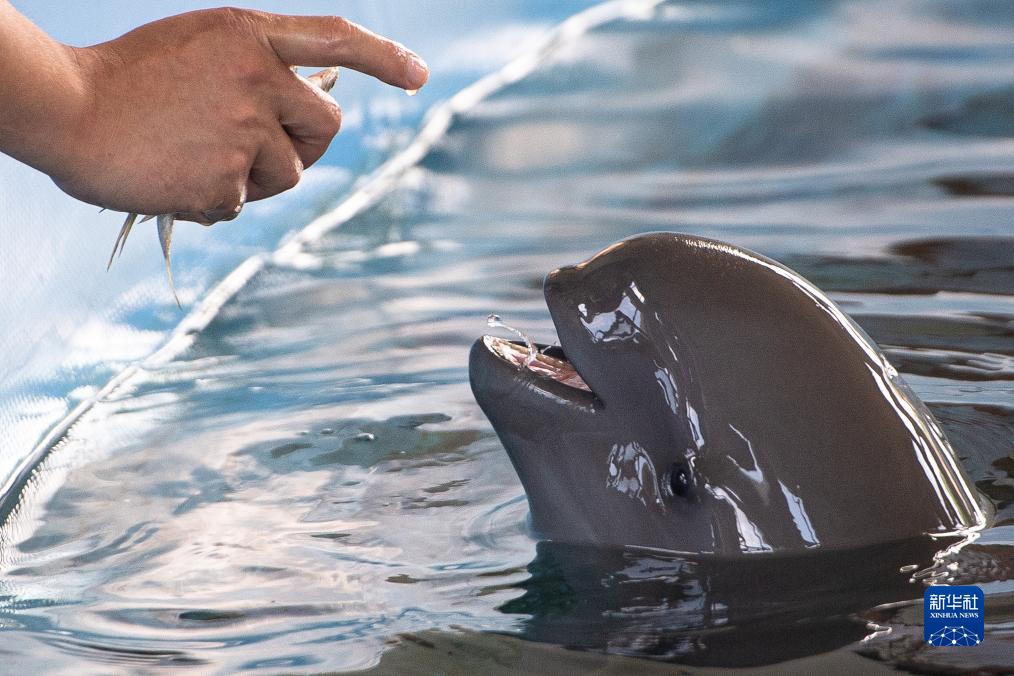 7月5日,中國科學院水生生物研究所白鱀豚館訓練員給小江豚“F9C22”喂食。