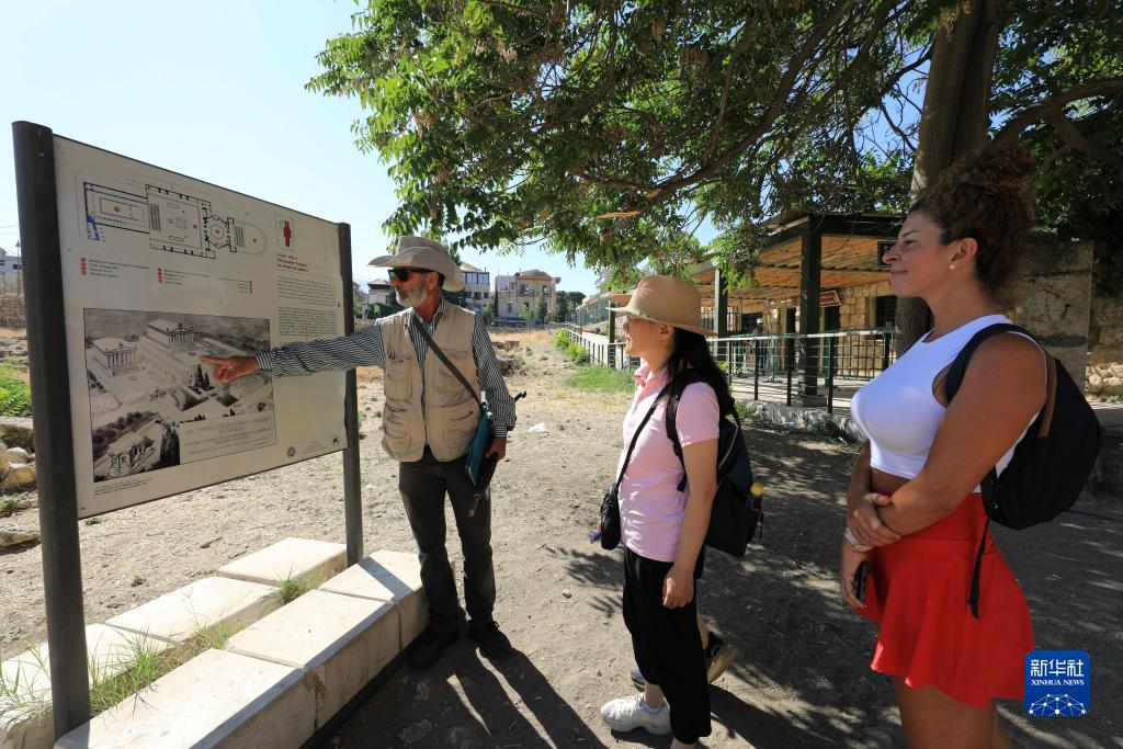 7月26日,在黎巴嫩巴勒貝克,一名導游在向游客介紹巴勒貝克神殿建築群遺址。